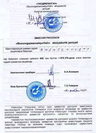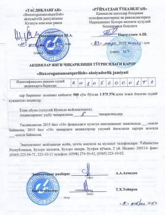 «Buxorogazsanoatqurilish» aksiyadorlik jamiyati aksiyadorlarining 10.01.2015 yildagi navbatdan tashqari umumiy yig'ilish qaroriga asosan yangi aksiyalar chiqarilishi to'g'risidagi qaror va emissiya risolasi.